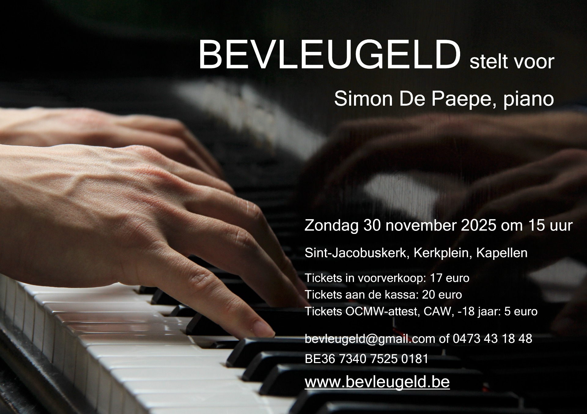 U bent hartelijk welkom in de Sint-Jacobuskerk van Kapellen. Het concert start om 15.00 uur. (De deuren zijn open vanaf 14.30u) Na het concert is er gelegenheid om gezellig na te praten met een drankje.